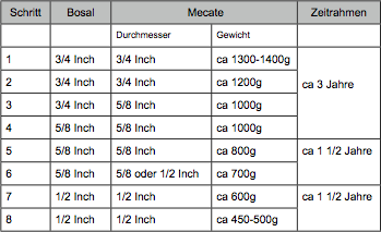 Mecates werden aus Mähnenhaar gefertigt. Bei der kalifornischen Hackamore geht es um das Gewicht, die Energie und die ans Pferd vermittelten Signale. Hierzu ist die Mähnenhaarmecate das Material der Wahl. Mit dem Gebrauch werden Mecates sehr weich und geschmeidig, gibt ein ganz tolles Gefühl in der Hand. Das muss sich der Reiter etwas erarbeiten. Ich gebe bei den Mecates immer das Gewicht an (siehe bitte auch nachstehende Tabelle als Richtlinie). Sollte eine Mecate mal etwas „schmutzig“ werden mit dem Gebrauch (Talg und Schweiss vom Pferd), so kann das Rope auch mal in einem Eimer mit milden Haarshampoo eingelegt, gründlich gespült werden und zum Trocknen entweder auf die Bodenheizung legen oder in grossen Bögen aufgehängt werden, so dass das Eigengewicht die Mecate streckt. Bitte keine Weichspüler und Mähnensprays verwenden!!!